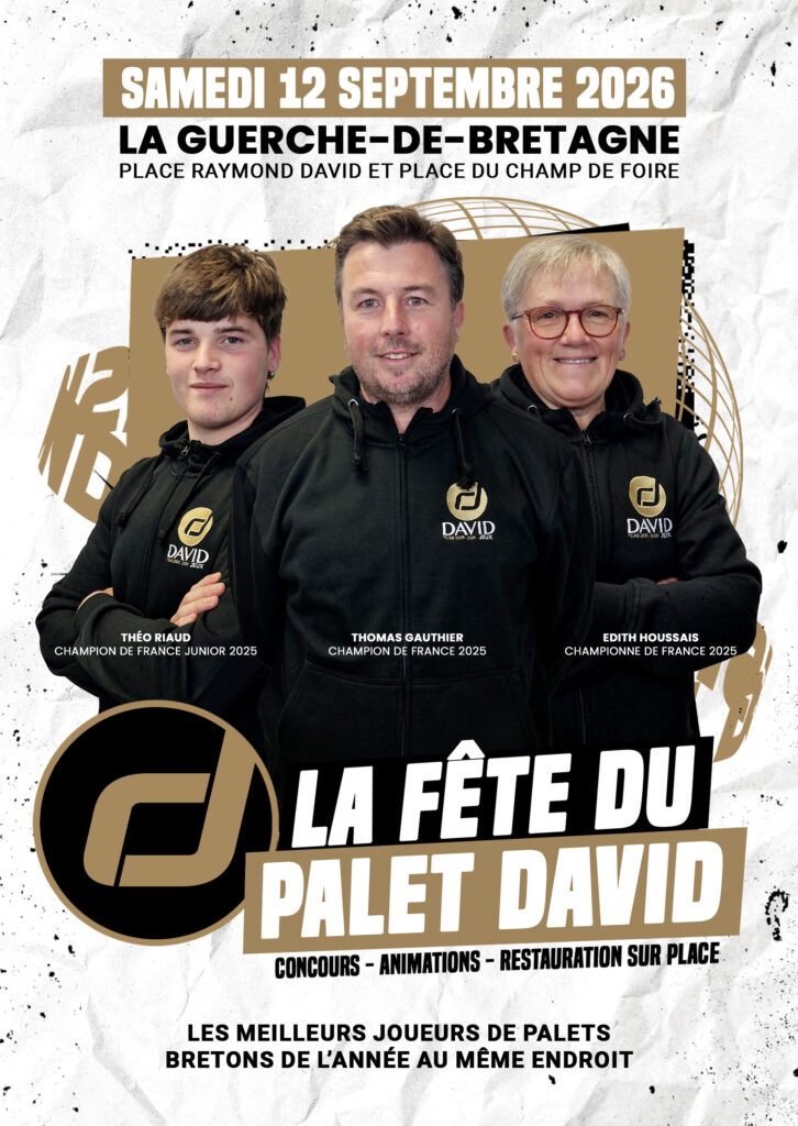 La Fête du Palet DAVID, le samedi 12 septembre 2026, sur la place Raymond DAVID à La Guerche-de-Bretagne, là-même où l’histoire du palet DAVID a commencé.