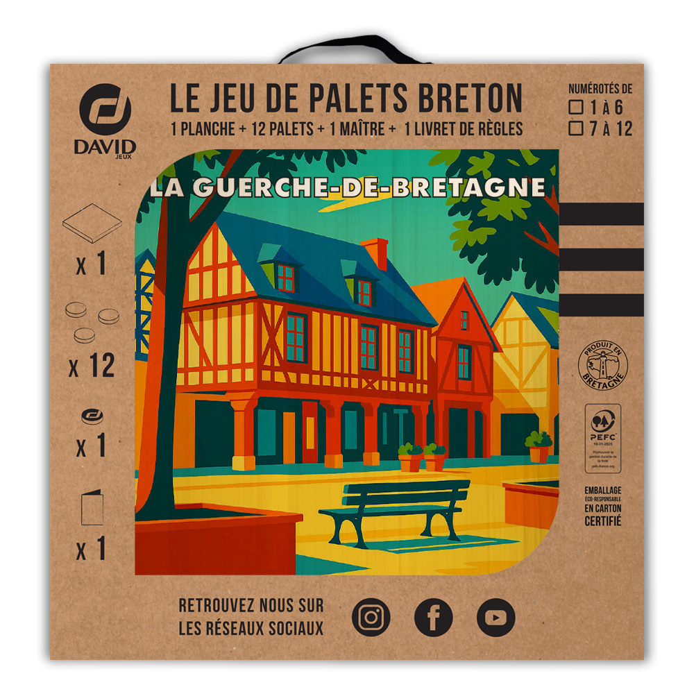 Une planche, 12 palets DAVID (de notre gamme l’Amical Breton), un maître, une règle du jeu et le tour est joué ! Vous voilà équipé pour jouer seul ou en équipe au jeu de palet. Par n’importe quel temps, en intérieur ou en extérieur, sortez votre planche et partagez une activité conviviale en famille ou entre amis. Cette sérigraphie originale est apposée sur une planche en peuplier.   Découvrez les règles du palet breton en vidéo : Les règles du palet breton