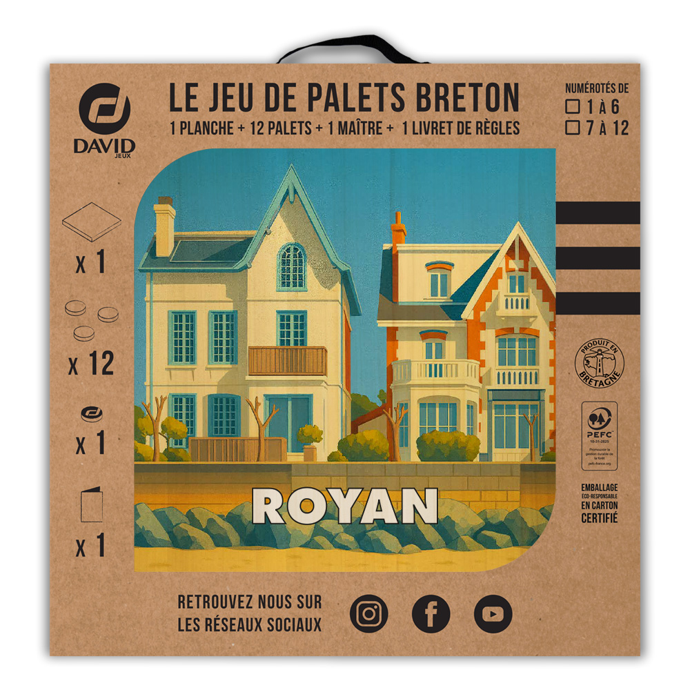 Une planche, 12 palets DAVID (de notre gamme l’Amical Breton), un maître, une règle du jeu et le tour est joué ! Vous voilà équipé pour jouer seul ou en équipe au jeu de palet. Par n’importe quel temps, en intérieur ou en extérieur, sortez votre planche et partagez une activité conviviale en famille ou entre amis. Cette sérigraphie originale est apposée sur une planche en peuplier.   Découvrez les règles du palet breton en vidéo : Les règles du palet breton