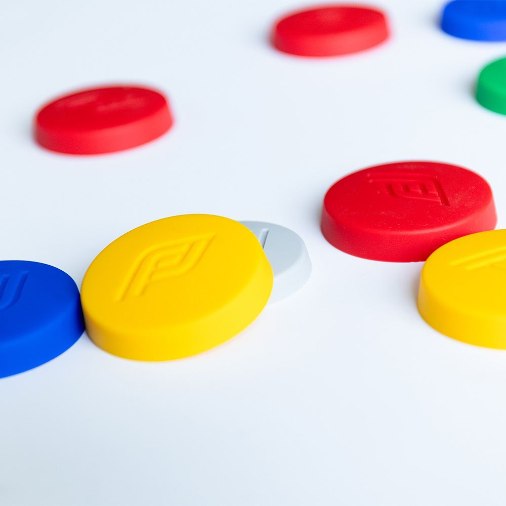 Contenu de la boîte : 16 palets colorés (4 rouges, 4 bleus, 4 verts, 4 jaunes), 2 maîtres et 1 tapis en silicone réversible.